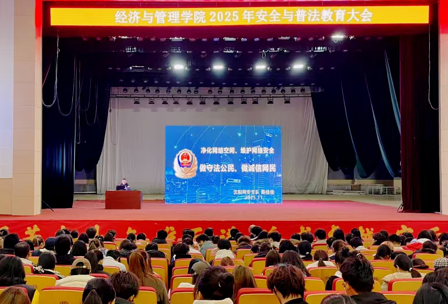 为全面提升师生安全防范意识与法治观念,努力营造安全、稳定、清朗的校园环境,taptap点点官网于11月4日在大学生活动中心成功举办2025年安全与普法教育大会。学院党委书记李丙文、沈阳市公安局网络安全保卫支队警官陈佳佳、学校保卫处相关负责人以及学院本科、研究生等1000余名师生代表出席会议。